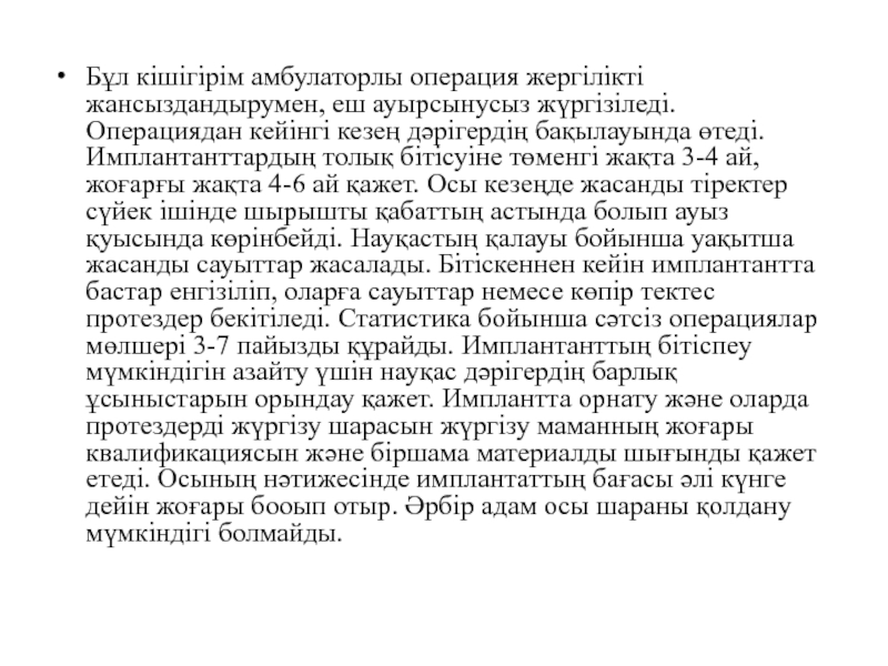 Слайд 15Бұл кішігірім амбулаторлы операция жергілікті жансыздандырумен, еш ауырсынусыз жүргізіледі. Операциядан кейінгі