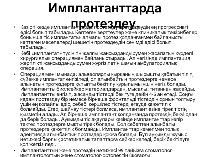 Қазіргі кезде имплантанттарда протездеу протездеудің ең прогрессивті әдісі болып табылады.