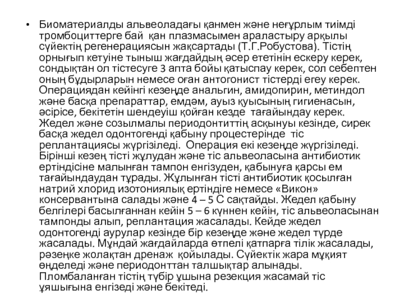 арқылы сүйектің регенерациясын жақсартады (Т.Г.Робустова). Тістің орнығып кетуіне тыныш жағдайдың әсер ететінін ескеру керек, сондықтан ол тістесуге 3 апта бойы қатыспау керек, сол себептен оның бұдырларын немесе оған антогонист тістерді егеу керек. Операциядан кейінгі кезеңде анальгин, амидопирин, метиндол және басқа препараттар, емдәм, ауыз қуысының гигиенасын, әсірісе, бекітетін шендеуіш қойған кезде тағайындау керек. Жедел және созылмалы периодонтиттің асқынуы кезінде, сирек басқа жедел одонтогенді қабыну процестерінде тіс реплантациясы жүргізіледі. Операция екі кезеңде жүргізіледі. Бірінші кезең тісті жұлудан және тіс альвеоласына антибиотик ертіндісіне малынған тампон енгізуден, қабынуға қарсы ем тағайындаудан тұрады. Жұлынған тісті антибиотик қосылған натрий хлорид изотониялық ертіндіге немесе «Викон» консервантына салады және 4 – 5 С сақтайды. Жедел қабыну белгілері басылғаннан кейін 5 – 6 күннен кейін, тіс альвеоласынан тампонды алып, реплантация жасалады. Кейде жедел одонтогенді аурулар кезінде бір кезеңде және жедел түрде жасалады. Мұндай жағдайларда өтпелі қатпарға тілік жасалады, рәзеңке жолақтан дренаж қойылады. Сүйектік жара мұқият өңделеді және периодонттан талшықтар алынады. Пломбаланған тістің түбір ұшына резекция жасамай тіс ұяшығына енгізеді және бекітеді.