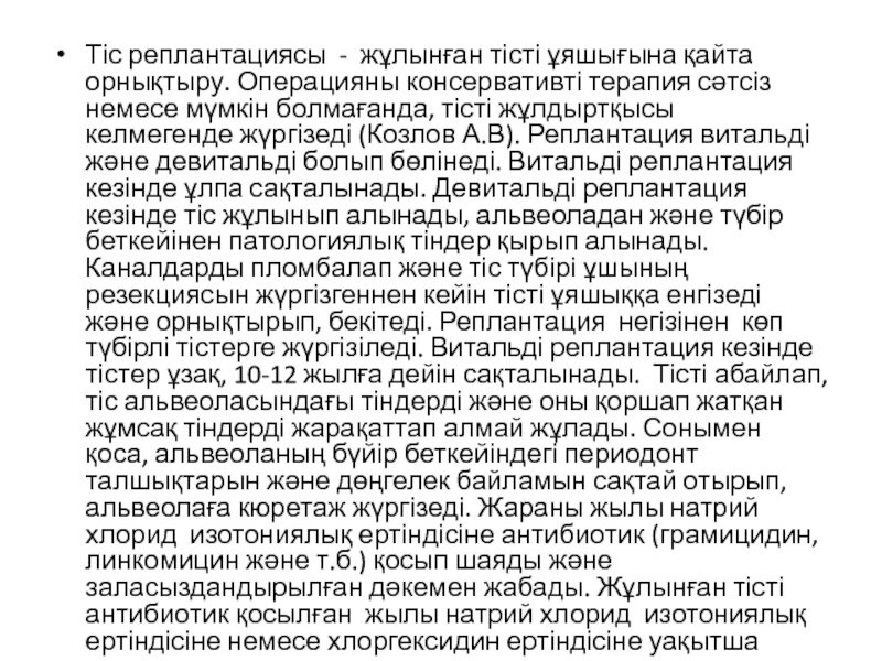 Слайд 5Тіс реплантациясы - жұлынған тісті ұяшығына қайта орнықтыру. Операцияны консервативті терапия