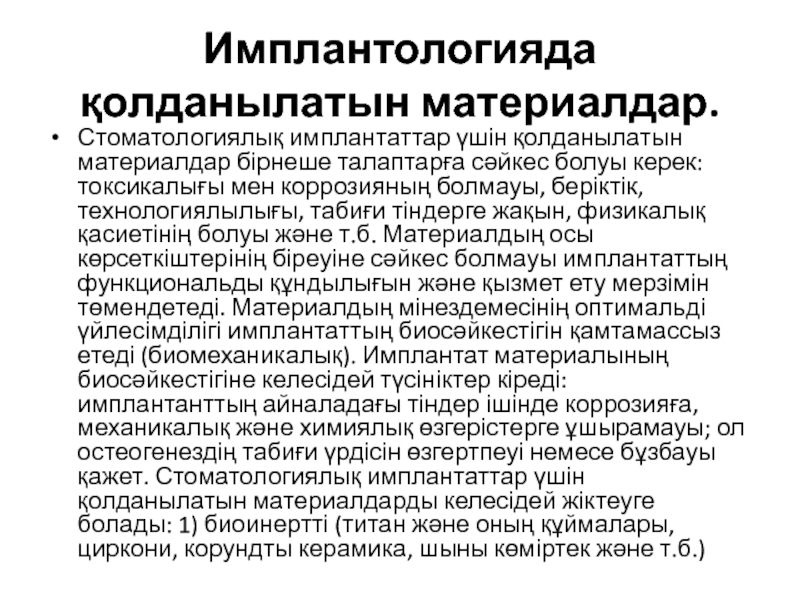 керек: токсикалығы мен коррозияның болмауы, беріктік, технологиялылығы, табиғи тіндерге жақын, физикалық қасиетінің болуы және т.б. Материалдың осы көрсеткіштерінің біреуіне сәйкес болмауы имплантаттың функциональды құндылығын және қызмет ету мерзімін төмендетеді. Материалдың мінездемесінің оптимальді үйлесімділігі имплантаттың биосәйкестігін қамтамассыз етеді (биомеханикалық). Имплантат материалының биосәйкестігіне келесідей түсініктер кіреді: имплантанттың айналадағы тіндер ішінде коррозияға, механикалық және химиялық өзгерістерге ұшырамауы; ол остеогенездің табиғи үрдісін өзгертпеуі немесе бұзбауы қажет. Стоматологиялық имплантаттар үшін қолданылатын материалдарды келесідей жіктеуге болады: 1) биоинертті (титан және оның құймалары, циркони, корундты керамика, шыны көміртек және т.б.)