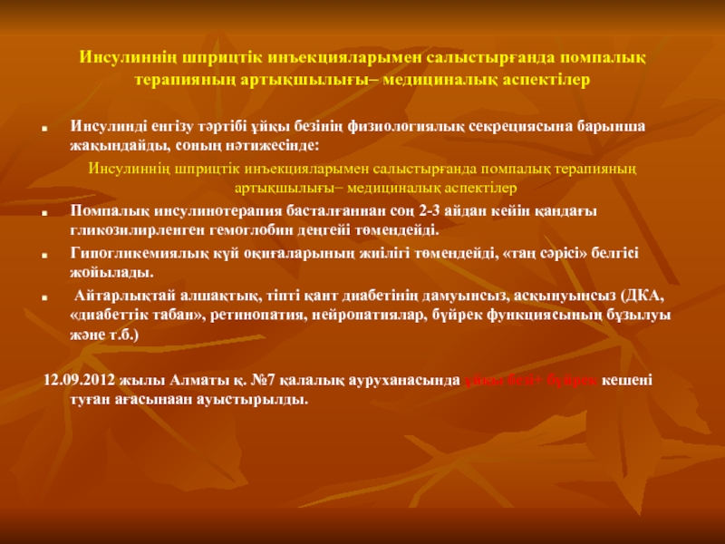 Слайд 13Инсулиннің шприцтік инъекцияларымен салыстырғанда помпалық терапияның артықшылығы– медициналық аспектілер