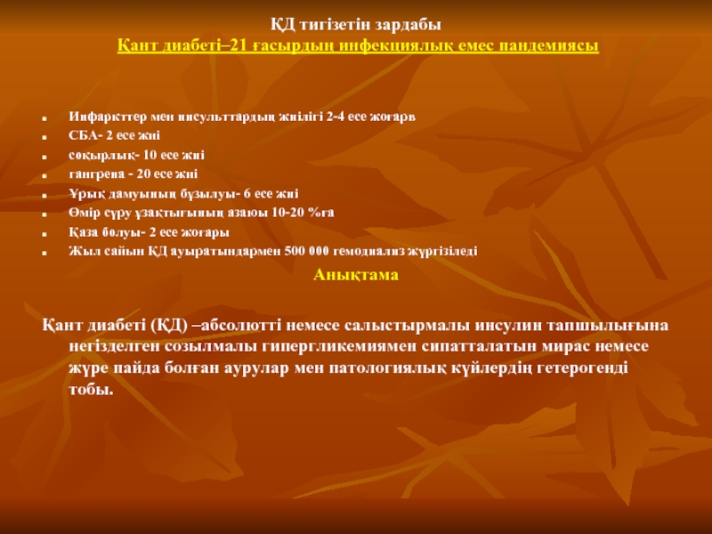 Қант диабеті (ҚД) –абсолютті немесе салыстырмалы инсулин тапшылығына негізделген созылмалы гипергликемиямен сипатталатын мирас немесе жүре пайда болған аурулар мен патологиялық күйлердің гетерогенді тобы.