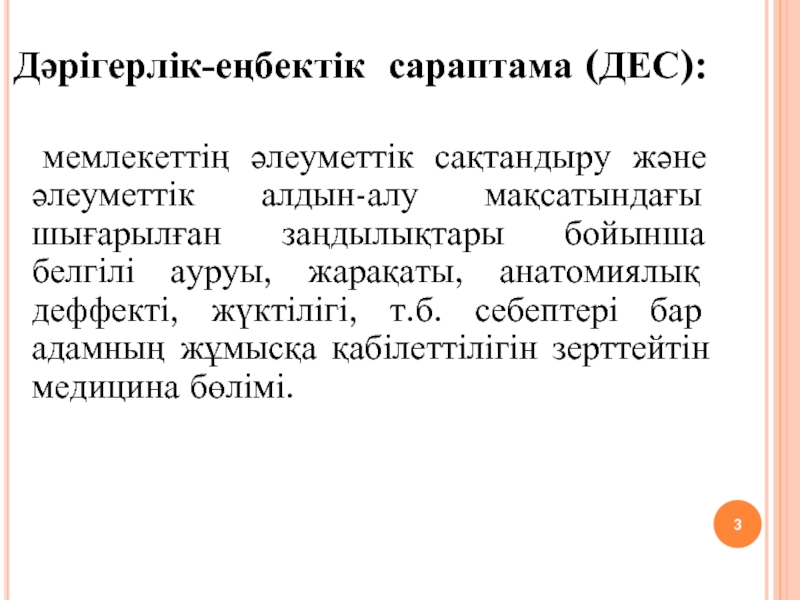 Слайд 3Дәрігерлік-еңбектік сараптама (ДЕС):