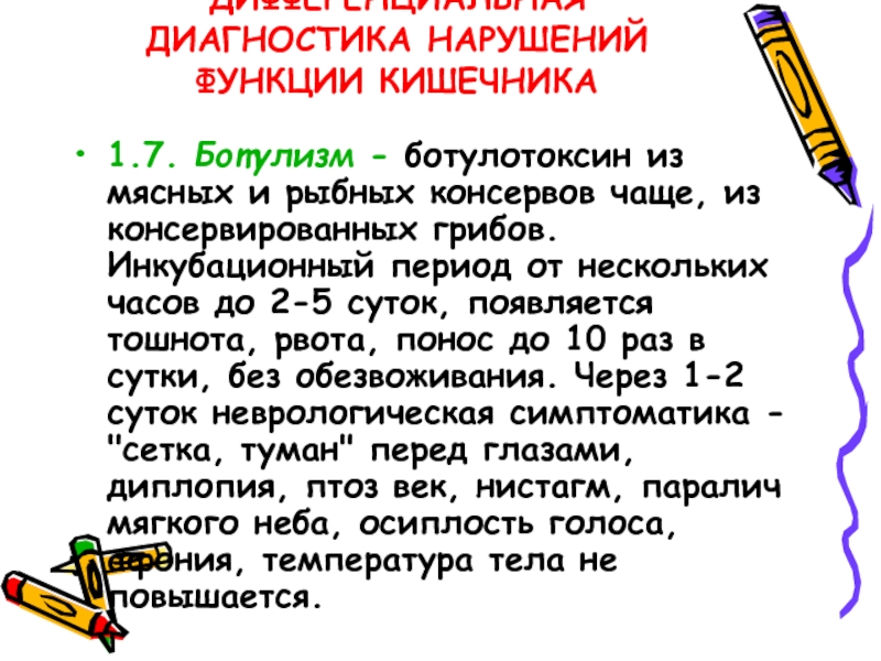 Слайд 7ДИФФЕРЕНЦИАЛЬНАЯ ДИАГНОСТИКА НАРУШЕНИЙ ФУНКЦИИ КИШЕЧНИКА