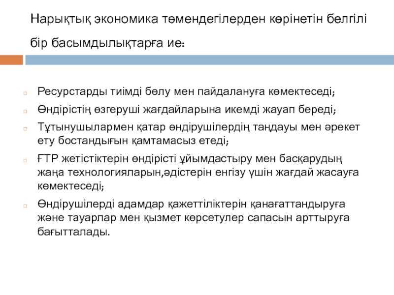 Слайд 4Нарықтық экономика төмендегілерден көрінетін белгілі бір басымдылықтарға ие: