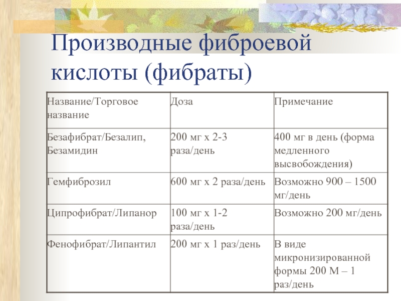 Производные фиброевой кислоты (фибраты);