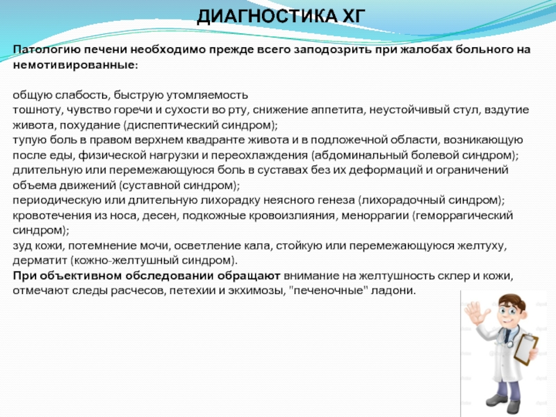 При объективном обследовании обращают внимание на желтушность склер и кожи, отмечают следы расчесов, петехии и экхимозы, "печеночные" ладони.