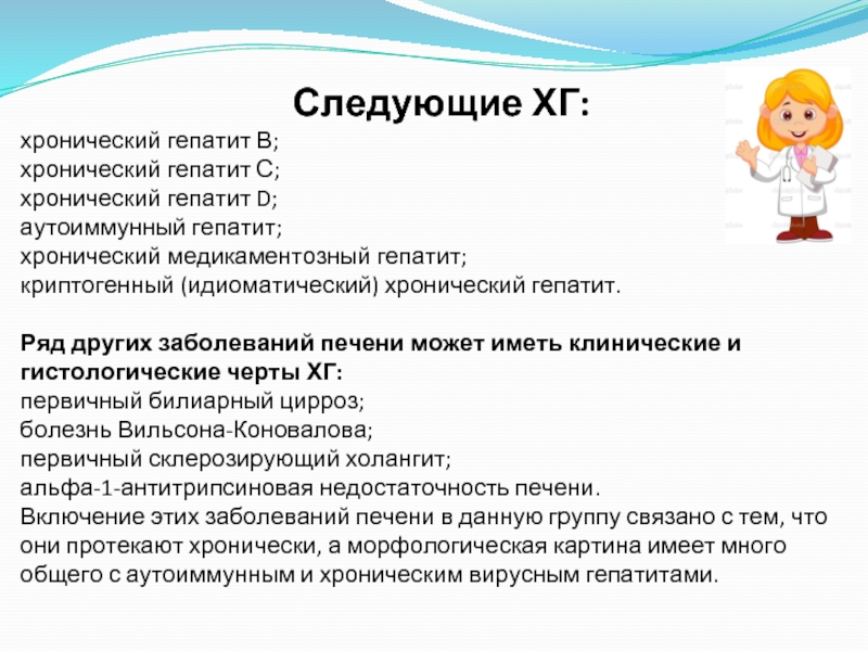 Ряд других заболеваний печени может иметь клинические и гистологические черты ХГ: