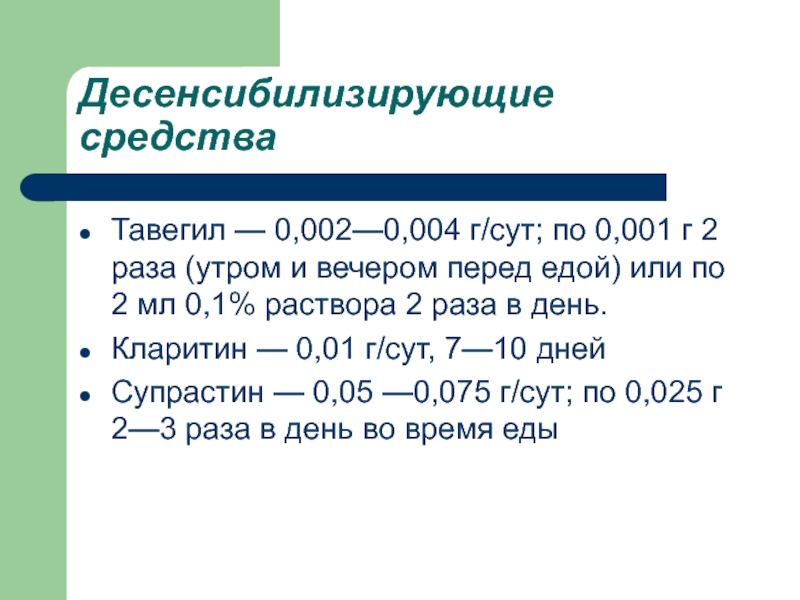Тавегил — 0,002—0,004 г/сут; по 0,001 г 2 раза (утром