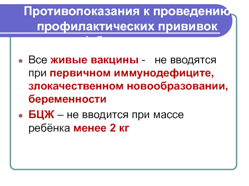 Слайд 29Противопоказания к проведению профилактических прививок (абсолютные)