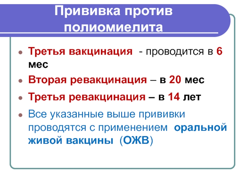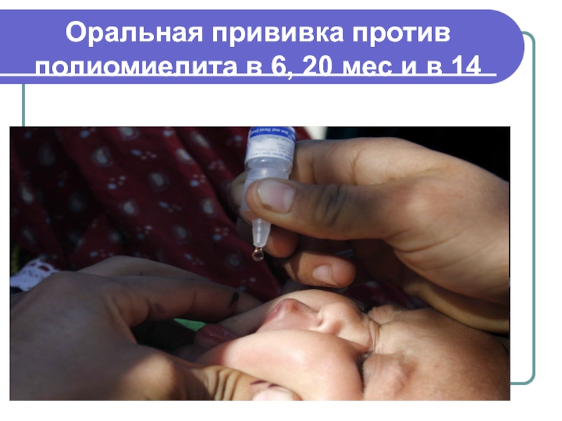 Слайд 35Оральная прививка против полиомиелита в 6, 20 мес и в 14