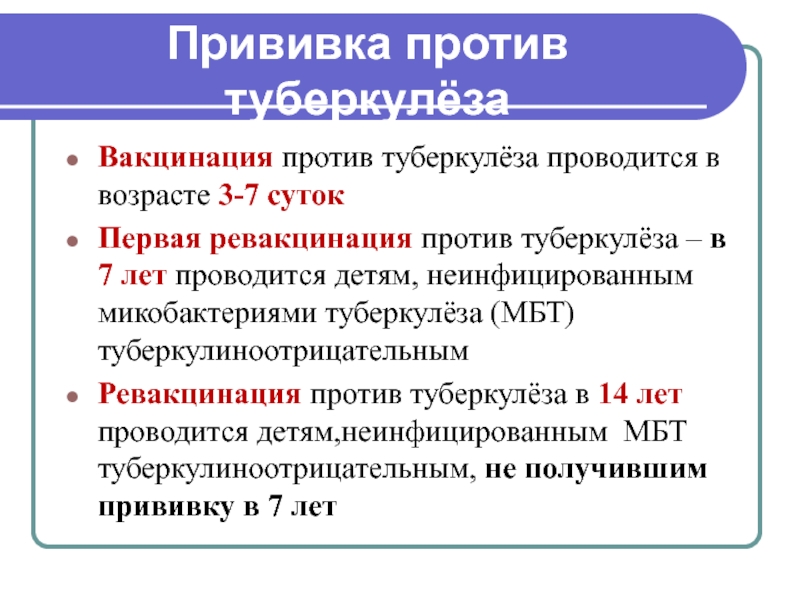 ревакцинация против туберкулёза – в 7 лет проводится детям, неинфицированным микобактериями туберкулёза (МБТ) туберкулиноотрицательным
