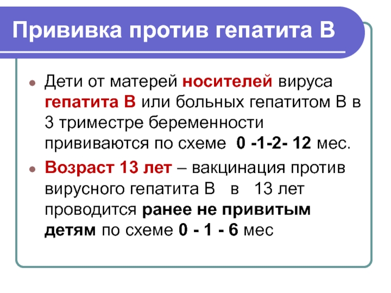 Возраст 13 лет – вакцинация против вирусного гепатита В в 13 лет проводится ранее не привитым детям по схеме 0 - 1 - 6 мес