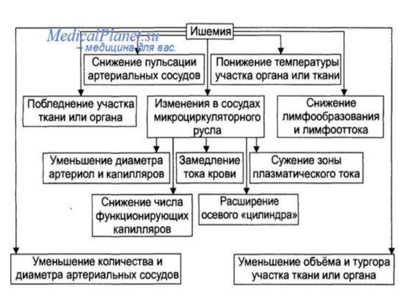 Слайд 2Ишемия — ослабление кровотока в периферическом и (или) микроциркуляторном русле вследствие