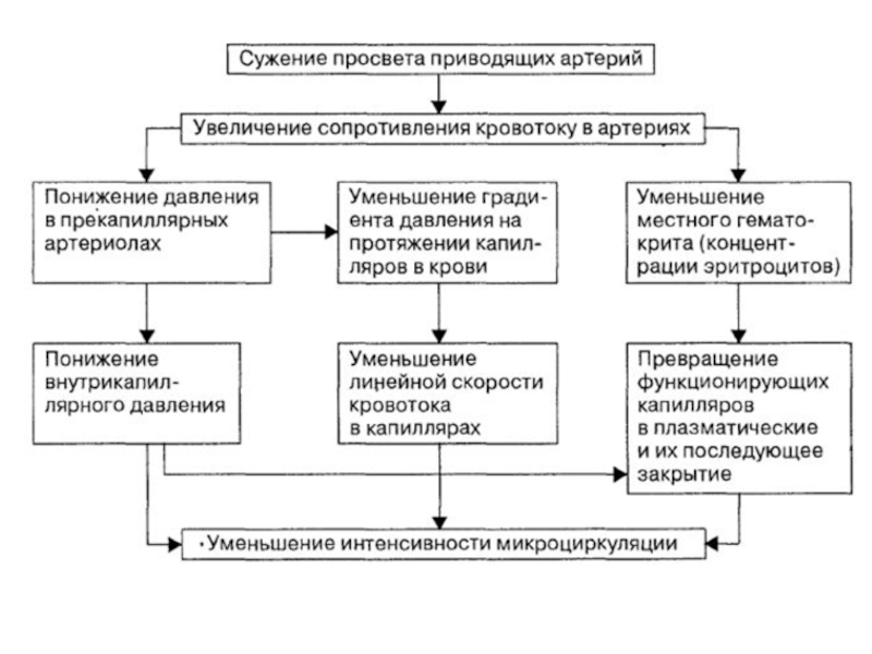 Давление падает прежде всего в мелких артериях и артериолах к периферии от места сужения или закупорки, поэтому артериовенозная разность давления на протяжении микроциркуляторного русла уменьшается, вызывая замедление линейной и объемной скорости кровотока в капиллярах.