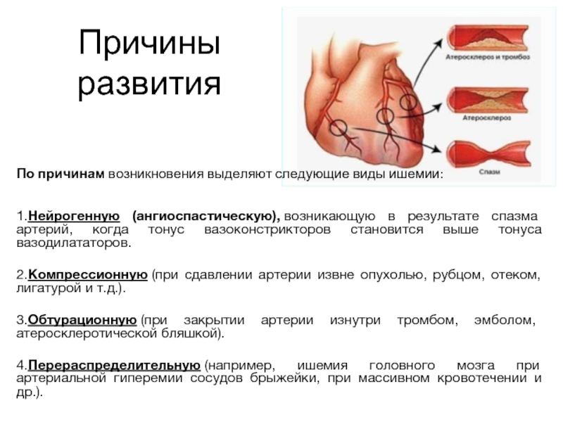 По причинам возникновения выделяют следующие виды ишемии: