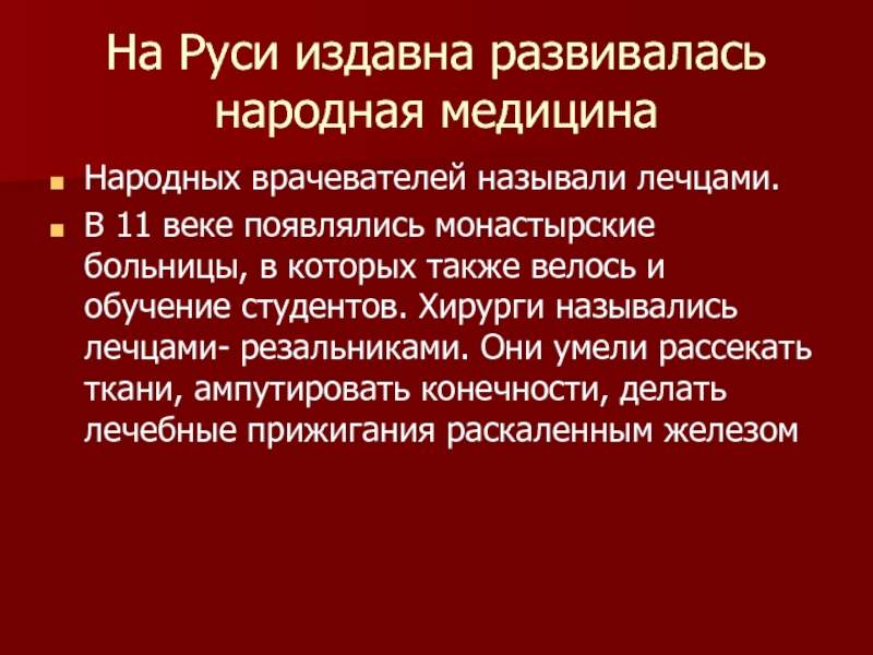 веке появлялись монастырские больницы, в которых также велось и обучение студентов. Хирурги назывались лечцами- резальниками. Они умели рассекать ткани, ампутировать конечности, делать лечебные прижигания раскаленным железом