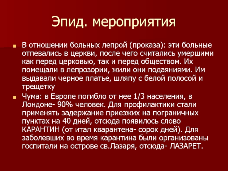Чума: в Европе погибло от нее 1/3 населения, в Лондоне- 90% человек. Для профилактики стали применять задержание приезжих на пограничных пунктах на 40 дней, отсюда появилось слово КАРАНТИН (от итал кварантена- сорок дней). Для заболевших во время карантина были организованы госпитали на острове св.Лазаря, отсюда- ЛАЗАРЕТ.