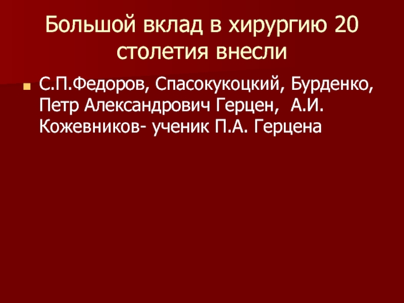 Слайд 39Большой вклад в хирургию 20 столетия внесли