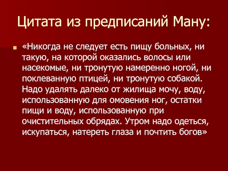 на которой оказались волосы или насекомые, ни тронутую намеренно ногой, ни поклеванную птицей, ни тронутую собакой. Надо удалять далеко от жилища мочу, воду, использованную для омовения ног, остатки пищи и воду, использованную при очистительных обрядах. Утром надо одеться, искупаться, натереть глаза и почтить богов»