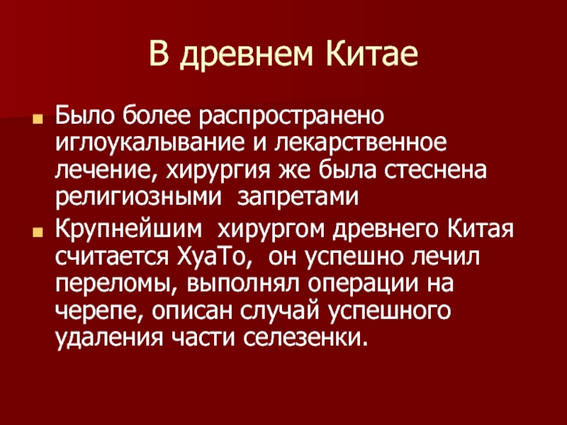 Крупнейшим хирургом древнего Китая считается ХуаТо, он успешно лечил переломы, выполнял операции на черепе, описан случай успешного удаления части селезенки.