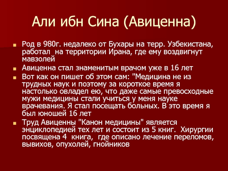 Труд Авиценны "Канон медицины" является энциклопедией тех лет и состоит из 5 книг. Хирургии посвящена 4 книга, где описано лечение переломов, вывихов, опухолей, гнойников