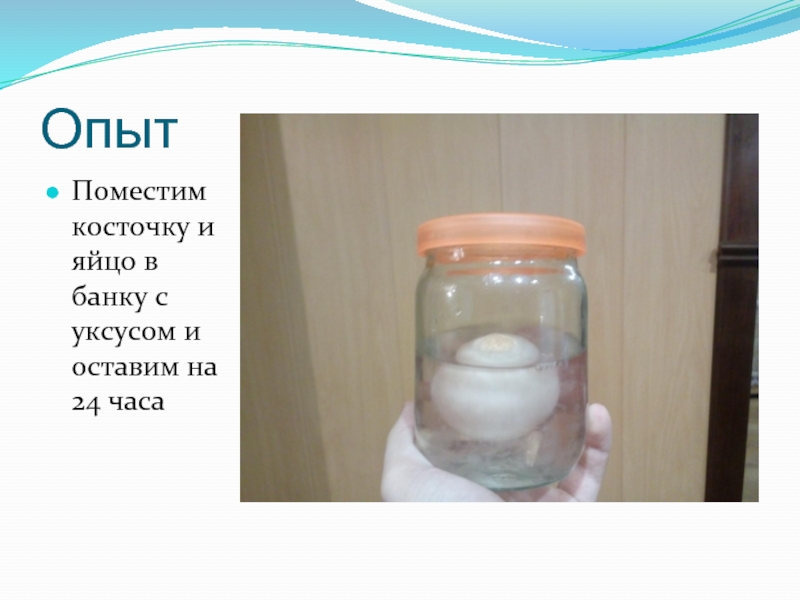 Поместим косточку и яйцо в банку с уксусом и оставим на