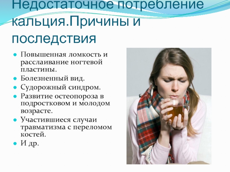 Слайд 9Недостаточное потребление кальция.Причины и последствия