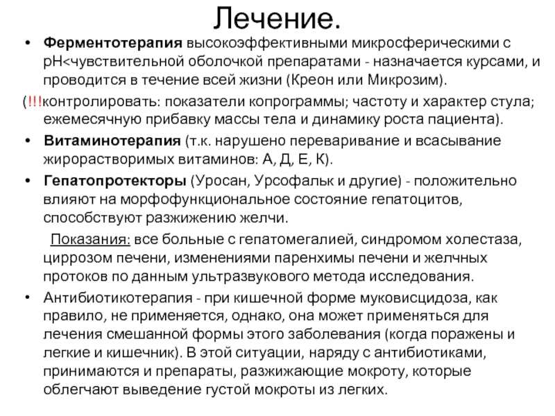Антибиотикотерапия - при кишечной форме муковисцидоза, как правило, не применяется, однако, она может применяться для лечения смешанной формы этого заболевания (когда поражены и легкие и кишечник). В этой ситуации, наряду с антибиотиками, принимаются и препараты, разжижающие мокроту, которые облегчают выведение густой мокроты из легких.
