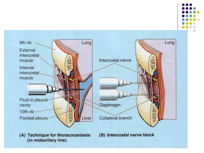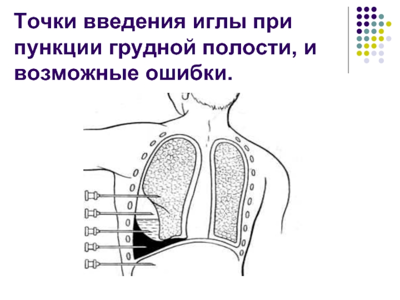 Слайд 12Точки введения иглы при пункции грудной полости, и возможные ошибки.