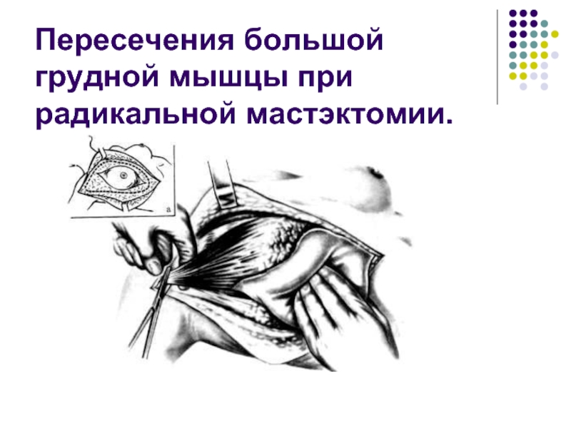 Слайд 23Пересечения большой грудной мышцы при радикальной мастэктомии.