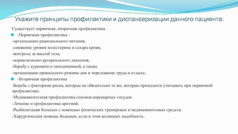 Слайд 15 Укажите принципы профилактики и диспансеризации данного пациента:
