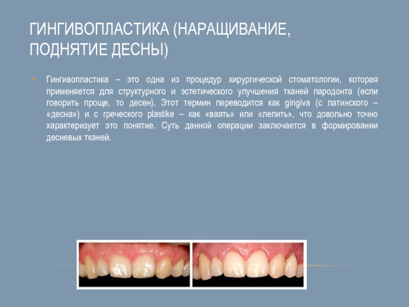 Слайд 16ГИНГИВОПЛАСТИКА (НАРАЩИВАНИЕ, ПОДНЯТИЕ ДЕСНЫ)