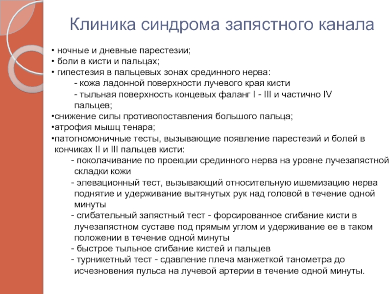 патогномоничные тесты, вызывающие появление парестезий и болей в кончиках II и III пальцев кисти: