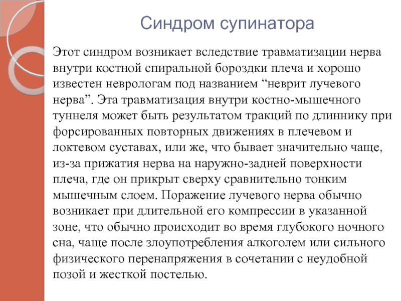 травматизации нерва внутри костной спиральной бороздки плеча и хорошо известен неврологам под названием “неврит лучевого нерва”. Эта травматизация внутри костно-мышечного туннеля может быть результатом тракций по длиннику при форсированных повторных движениях в плечевом и локтевом суставах, или же, что бывает значительно чаще, из-за прижатия нерва на наружно-задней поверхности плеча, где он прикрыт сверху сравнительно тонким мышечным слоем. Поражение лучевого нерва обычно возникает при длительной его компрессии в указанной зоне, что обычно происходит во время глубокого ночного сна, чаще после злоупотребления алкоголем или сильного физического перенапряжения в сочетании с неудобной позой и жесткой постелью.