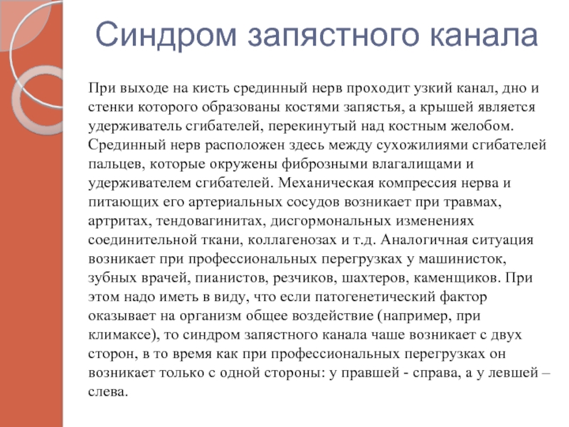 дно и стенки которого образованы костями запястья, а крышей является удерживатель сгибателей, перекинутый над костным желобом. Срединный нерв расположен здесь между сухожилиями сгибателей пальцев, которые окружены фиброзными влагалищами и удерживателем сгибателей. Механическая компрессия нерва и питающих его артериальных сосудов возникает при травмах, артритах, тендовагинитах, дисгормональных изменениях соединительной ткани, коллагенозах и т.д. Аналогичная ситуация возникает при профессиональных перегрузках у машинисток, зубных врачей, пианистов, резчиков, шахтеров, каменщиков. При этом надо иметь в виду, что если патогенетический фактор оказывает на организм общее воздействие (например, при климаксе), то синдром запястного канала чаше возникает с двух сторон, в то время как при профессиональных перегрузках он возникает только с одной стороны: у правшей - справа, а у левшей – слева.