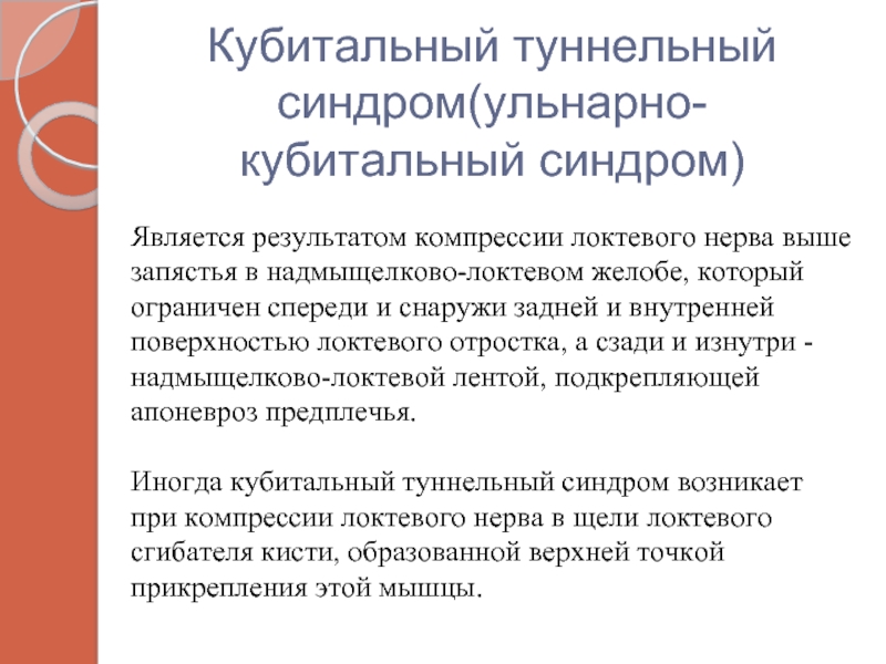 Слайд 22Кубитальный туннельный синдром(ульнарно-кубитальный синдром)