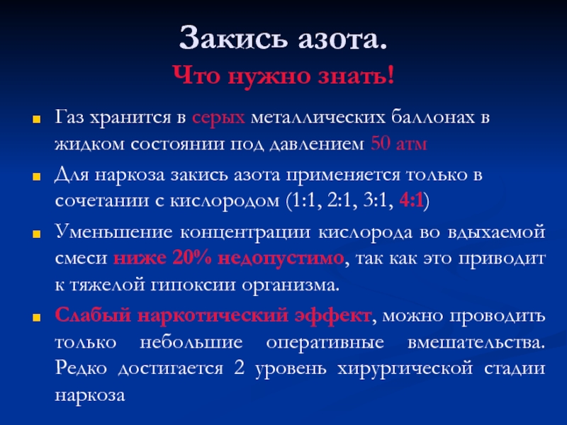 Для наркоза закись азота применяется только в сочетании с кислородом (1:1, 2:1, 3:1, 4:1)