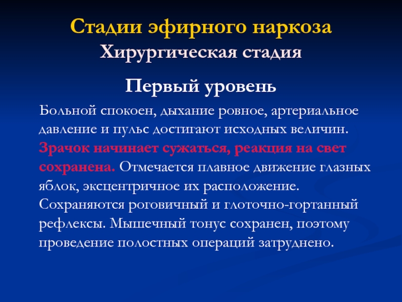 и они располагаются в центральном положении. Зрачки начинают постепенно расширяться, реакция зрачка на свет ослабевает. Роговичный и глоточно-гортанный рефлексы ослабевают и к концу второго уровня исчезают. Дыхание спокойное, ровное. Артериальное давление и пульс нормальные. Начинается понижение мышечного тонуса, что позволяет осуществлять брюшно-полостные операции.