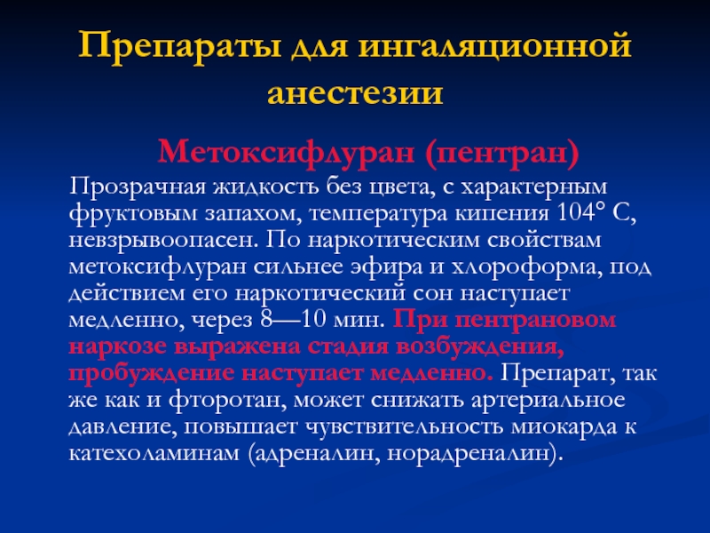цвета, с характерным фруктовым запахом, температура кипения 104° С, невзрывоопасен. По наркотическим свойствам метоксифлуран сильнее эфира и хлороформа, под действием его наркотический сон наступает медленно, через 8—10 мин. При пентрановом наркозе выражена стадия возбуждения, пробуждение наступает медленно. Препарат, так же как и фторотан, может снижать артериальное давление, повышает чувствительность миокарда к катехоламинам (адреналин, норадреналин).