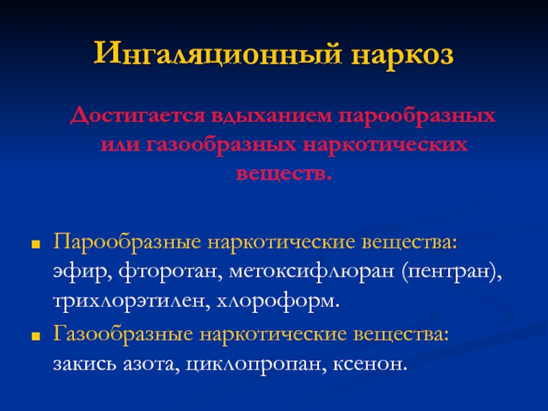 Газообразные наркотические вещества: закись азота, циклопропан, ксенон.