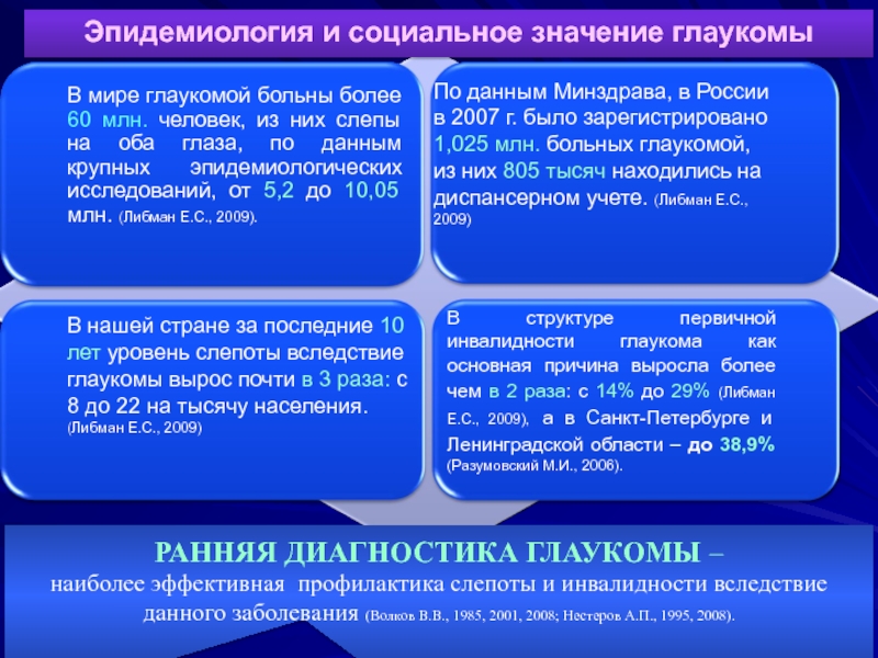 В нашей стране за последние 10 лет уровень слепоты вследствие глаукомы вырос почти в 3 раза: с 8 до 22 на тысячу населения. (Либман Е.С., 2009)