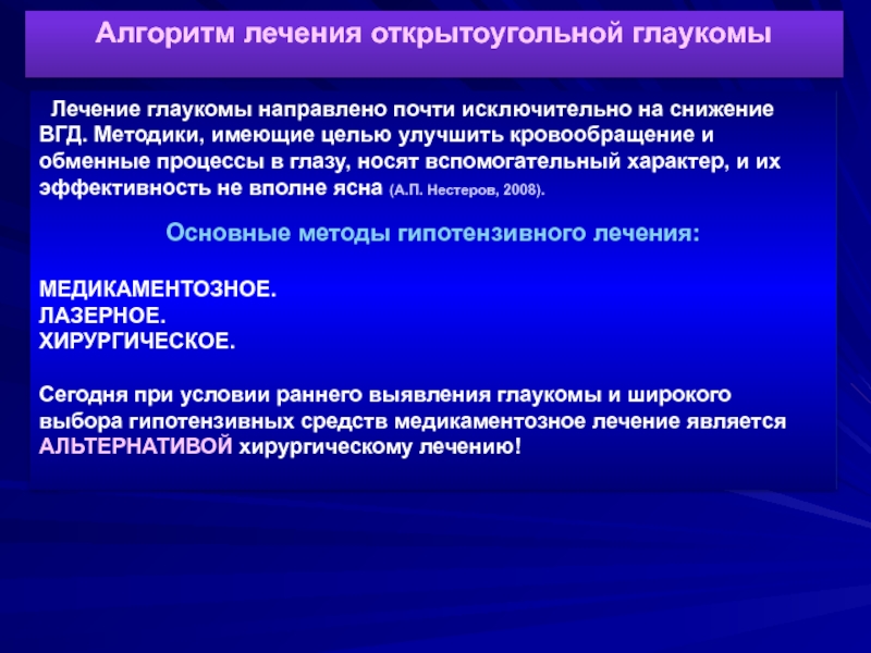 наиболее эффективная профилактика слепоты и инвалидности вследствие данного заболевания (Волков В.В., 1985, 2001, 2008; Нестеров А.П., 1995, 2008).