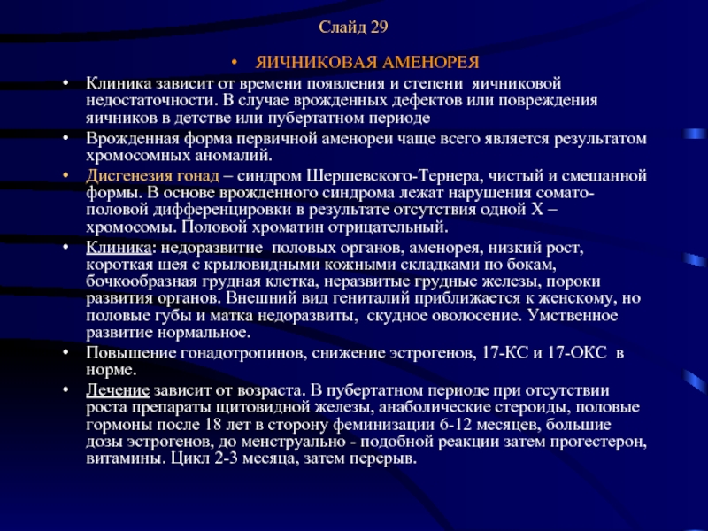 Клиника: проявляется в период полового созревания - диспропорция между половым и соматическим развитием. Половые органы при нормальном росте недоразвиты, месячные отсутствуют. Снижение гонадотропинов. Тропные гормоны , основной обмен, 17КС в норме.