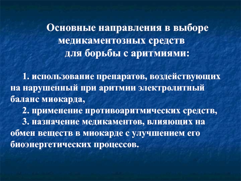 использование препаратов, воздействующих на нарушенный при аритмии электролитный баланс миокарда,