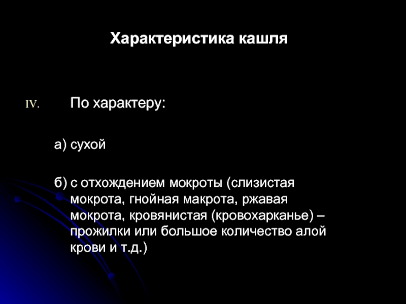 гнойная макрота, ржавая мокрота, кровянистая (кровохарканье) – прожилки или большое количество алой крови и т.д.)