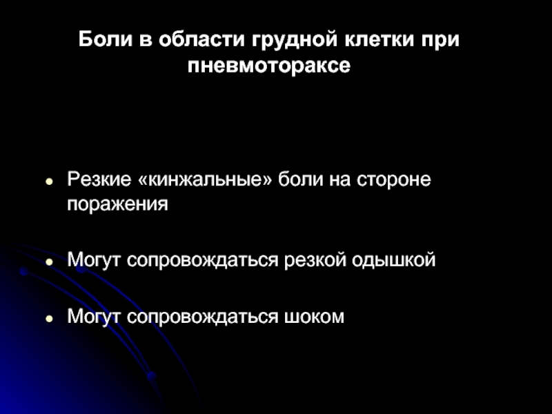 Слайд 5Боли в области грудной клетки при пневмотораксе