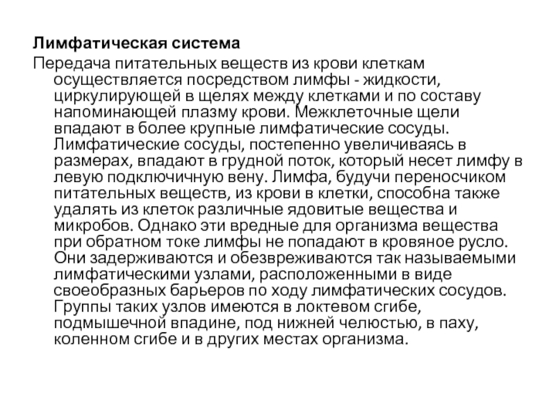 жидкости, циркулирующей в щелях между клетками и по составу напоминающей плазму крови. Межклеточные щели впадают в более крупные лимфатические сосуды. Лимфатические сосуды, постепенно увеличиваясь в размерах, впадают в грудной поток, который несет лимфу в левую подключичную вену. Лимфа, будучи переносчиком питательных веществ, из крови в клетки, способна также удалять из клеток различные ядовитые вещества и микробов. Однако эти вредные для организма вещества при обратном токе лимфы не попадают в кровяное русло. Они задерживаются и обезвреживаются так называемыми лимфатическими узлами, расположенными в виде своеобразных барьеров по ходу лимфатических сосудов. Группы таких узлов имеются в локтевом сгибе, подмышечной впадине, под нижней челюстью, в паху, коленном сгибе и в других местах организма.