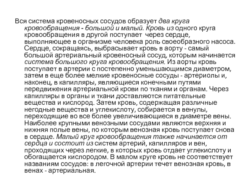 малый. Кровь из одного круга кровообращения в другой поступает через сердце, выполняющее в организме человека роль своеобразного насоса. Сердце, сокращаясь, выбрасывает кровь в аорту - самый большой артериальный кровеносный сосуд, которым начинается система большого круга кровообращения. Из аорты кровь поступает в артерии с постепенно уменьшающимся диаметром, затем в еще более мелкие кровеносные сосуды - артериолы и, наконец, в капилляры, являющиеся конечными путями передвижения артериальной крови по тканям и органам. Через капилляры в органы и ткани доставляются питательные вещества и кислород. Затем кровь, содержащая различные негодные вещества и углекислоту, собирается в венулы, переходящие во все более увеличивающиеся в диаметре вены. Наиболее крупными венозными сосудами являются верхняя и нижняя полые вены, по которым венозная кровь поступает снова в сердце. Малый круг кровообращения также начинается от сердца и состоит из систем артерий, капилляров и вен, проходящих через легкие, в которых кровь отдает углекислоту и обогащается кислородом. В малом круге кровь не соответствует названиям сосудов: в легочной артерии течет венозная кровь, в венах - артериальная.